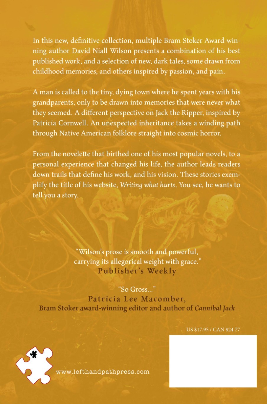 In this new, definitive collection, multiple Bram Stoker Award-winning author David Niall Wilson presents a combination of his best published work and a selection of new, dark tales, some drawn from childhood memories, and others inspired by passion and pain. A man is called to the tiny, dying town where he spent years with his grandparents, only to be drawn into memories that were never what they seemed. A different perspective on Jack the Ripper, inspired by Patricia Cornwell. An unexpected inheritance takes a winding path through Native American folklore straight into cosmic horror. From the novelette that birthed one of his most popular novels to a personal experience that changed his life, the author leads readers down trails that define his work and his vision. These stories exemplify the title of his website. “Writing what hurts.” You see, he wants to tell you a story.